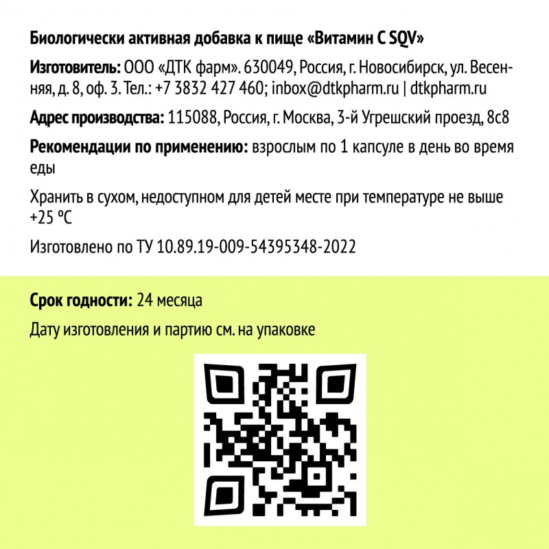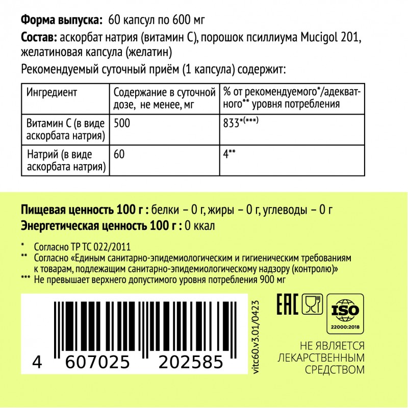 Состав: аскорбат натрия (витамин C), микрокристаллическая целлюлоза (МКЦ), желатиновая капсула (желатин, красители: диоксид титана, оксид железа).
