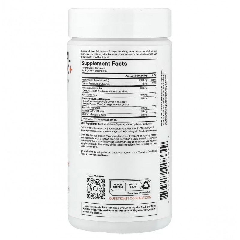 Липосомальный витамин C+ от Codeage — это высокоэффективная добавка, содержащая 1500 мг витамина C, цитрусовые биофлавоноиды, кверцетин, бузину, шиповник, цинк и альфа-липоевую кислоту. Эти усовершенствованные капсулы с витамином C также имеют липосомальную форму доставки.