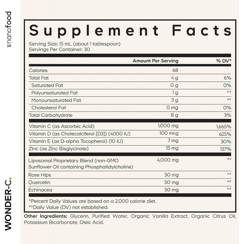 Жидкие витамины Liposomal Wonder-C от Codeage Nanofood содержат 1000 мг витамина C в жидкой форме в виде аскорбиновой кислоты.