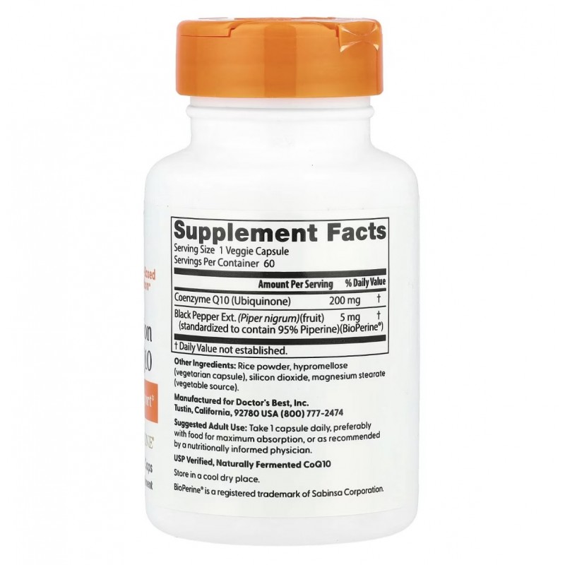 Doctor's Best, легкоусвояемый коэнзим Q10 200 мг, с BioPerine, 200 мг, 60 вегетарианских капсул