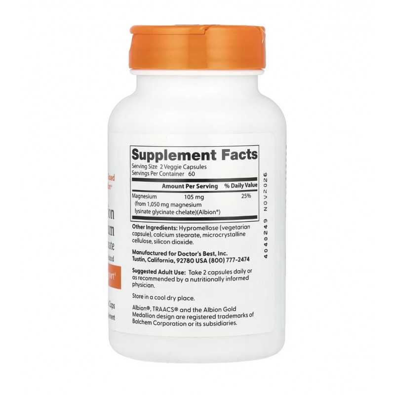 Doctor's Best, Магний глицинат с высокой степенью усвоения, 120 капсул
