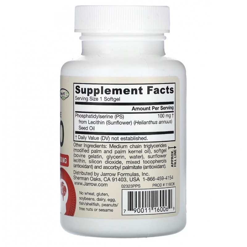 Фосфатидилсерин (ФС) — это натуральный фосфолипид, входящий в состав клеточных мембран. Это важный фосфолипид, присутствующий в мозге и поддерживающий его здоровье. Добавка PS100 с Sharp-PS® от Jarrow Formulas® содержит концентрированную форму фосфатидилсерина из подсолнечного лецитина (без сои), которая обеспечивает превосходную стабильность.