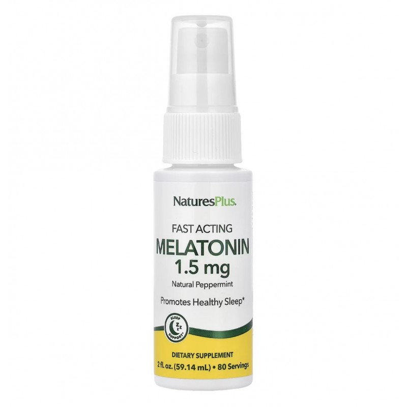 NaturesPlus, Fast acting Melatonin, Мелатонин быстродействующий 1.5 мг, натуральная перечная мята, спрей, 59.14 мл